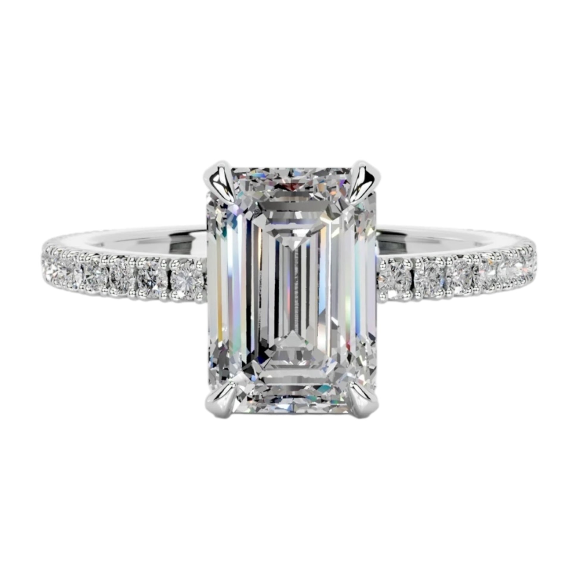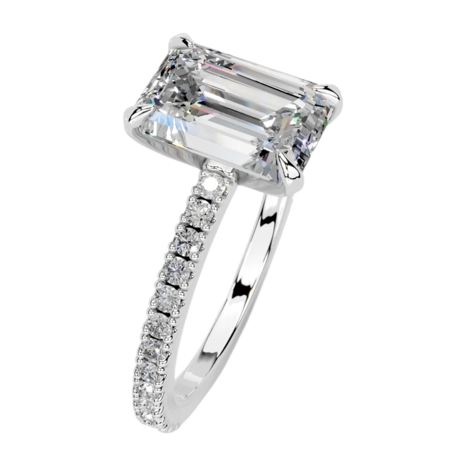 2.3 carat. Emerald cut. Side stones. 14k white gold